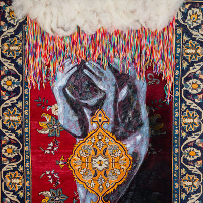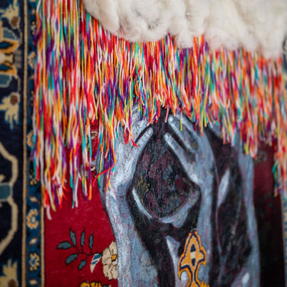 Acrylic and spray paint and Rainbow wool on old vintage Persian carpet